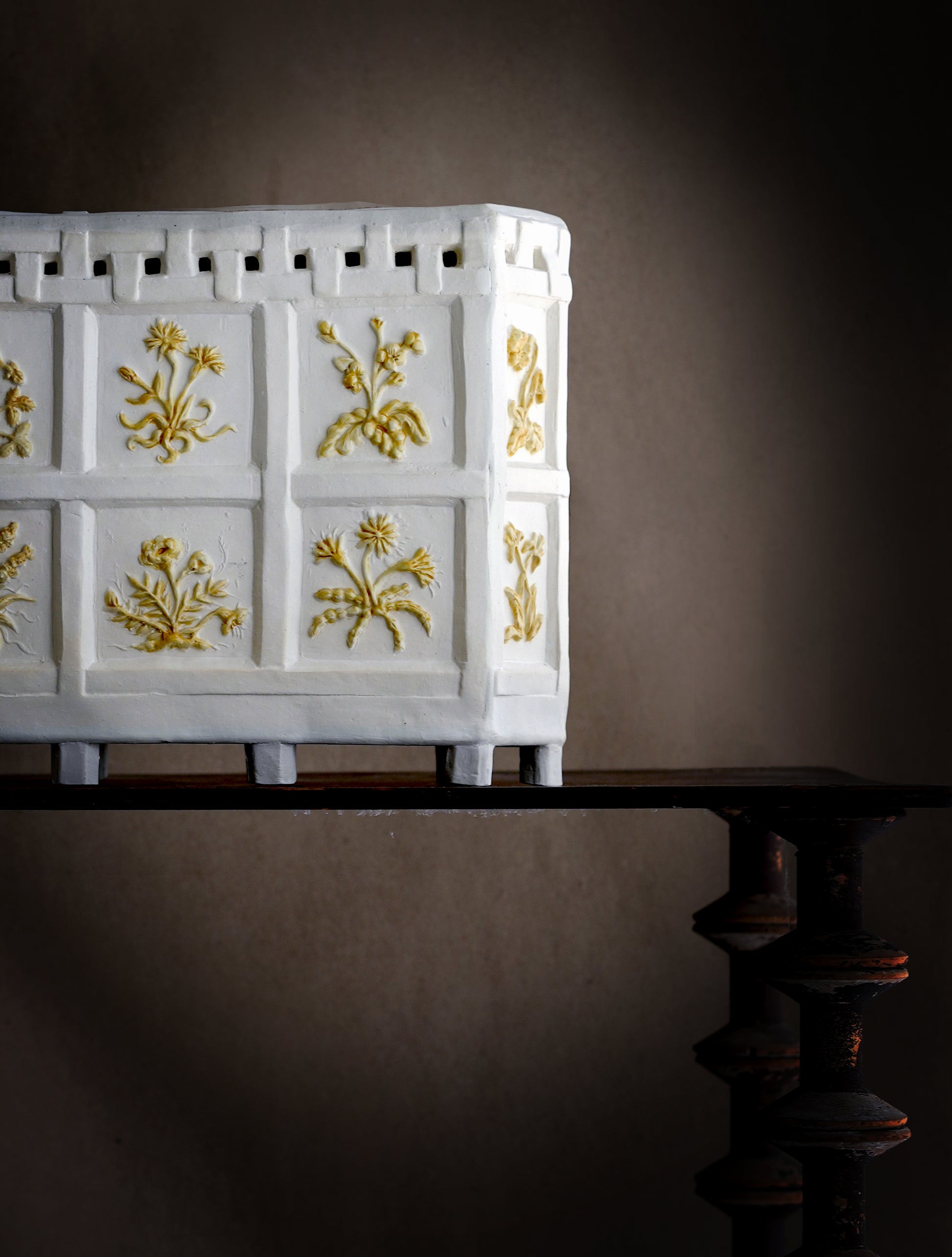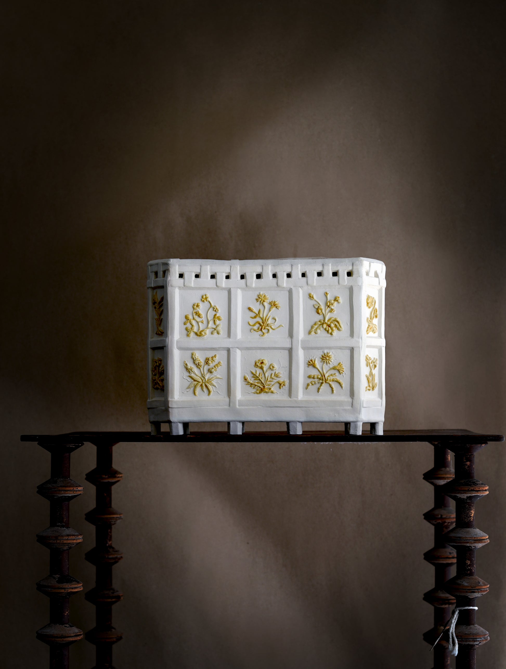 Medium: Unglazed porcelain exterior with with individually hand coloured flowers in Wheat field yellow. (glazed internally)