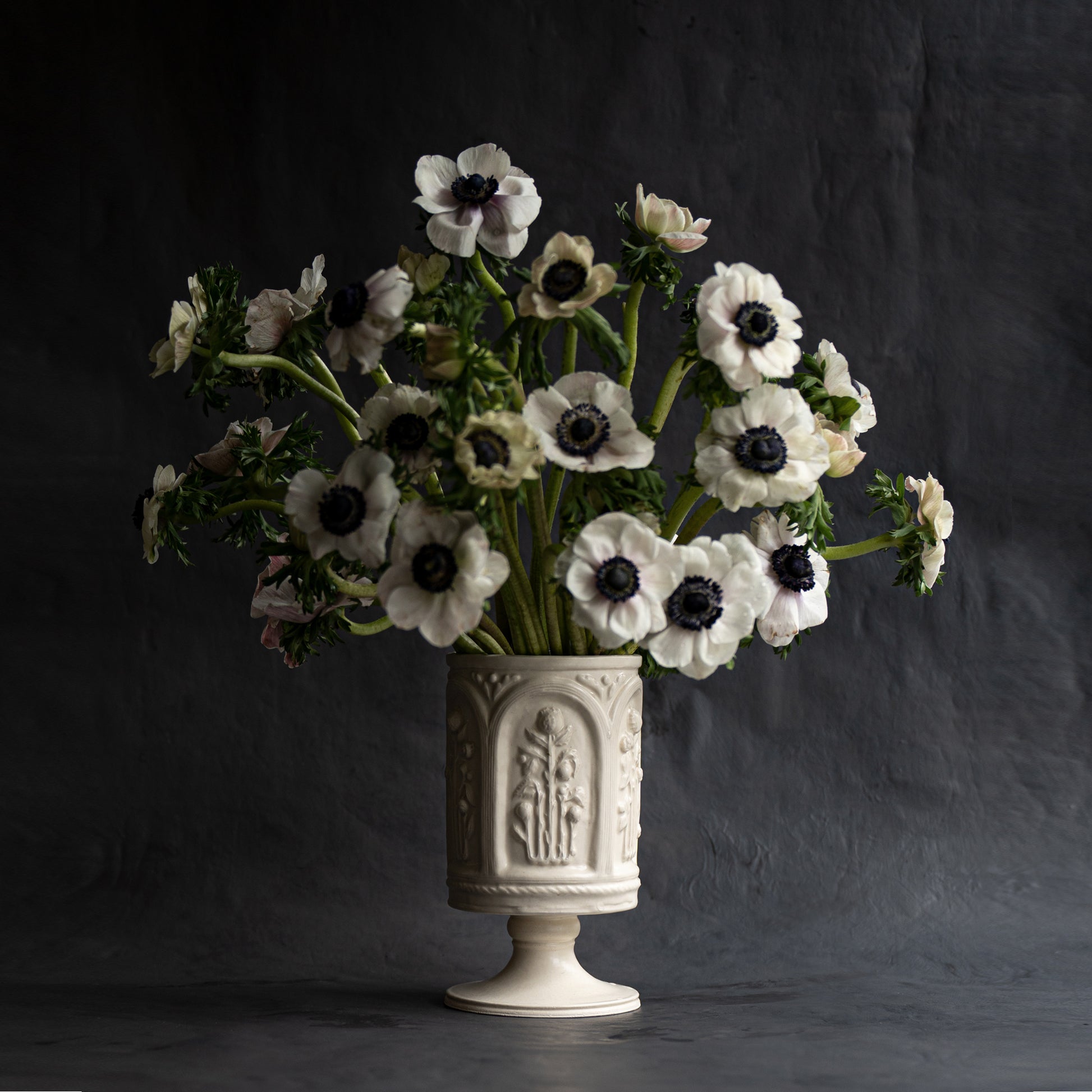 The Floral Folly Urn is a medium sized pedestal vase that presents well with or without flowers. Medium (a dozen blooms) to large arrangements (1 1/2 times of the height of the vase) are recommended. Externally and internally glazed with a clear, soft, matte glaze.